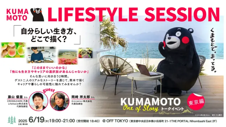 | 19:05 | トークセッション「自分らしい生き方、どこで描く?KUMAMOTO LIFESTYLE SESSION」 ゲスト:藤山 優里 さん(CROSSLEARN 代表/LifeAssist株式会社 代表取締役) 岡崎 祥太郎 さん(ひととみらい株式会社 代表取締役) |