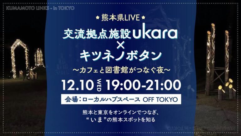| 19:00-20:00 | 常時接続ライブセッション(東京⇄南関町) ・南関の位置関係を、現地と会話しながら可視化(Google MAPも活用) ・参加者の熊本との接点をヒアリング ・南関町ゲストトーク (トークテーマ) ・旧温泉 交流拠点施設〈ukara〉のリデザインストーリー ・南関あげ 新解釈「キツネノボタン」の物語 ・2つの取り組みが交わった背景と、南関で起きている変化 |