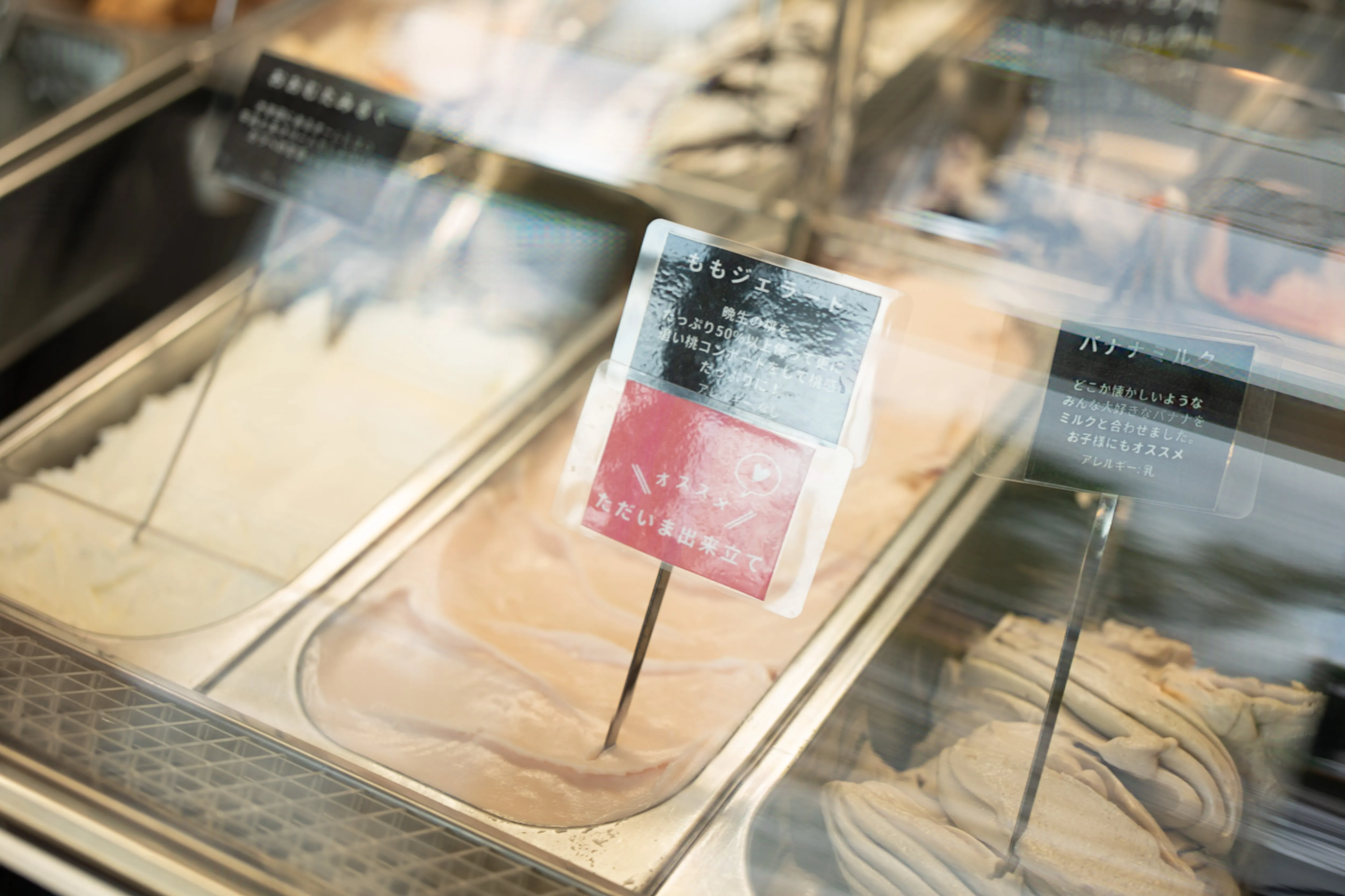 <夏に大人気の「ももジェラート」は近隣の農園の桃を使用>