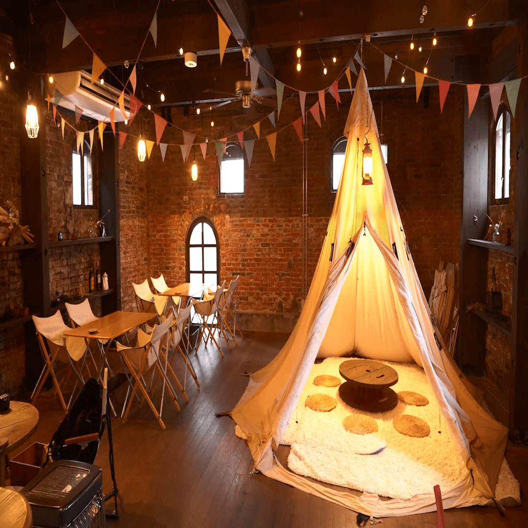 キャンプ用品を取り入れた内装や、