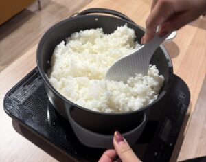 今回使用した三条市のUNILLOYさんのホーロー鍋は鋳物鍋の中では世界一軽いと言われ、蓄熱・保温効果に優れているので炊飯にも最適です。